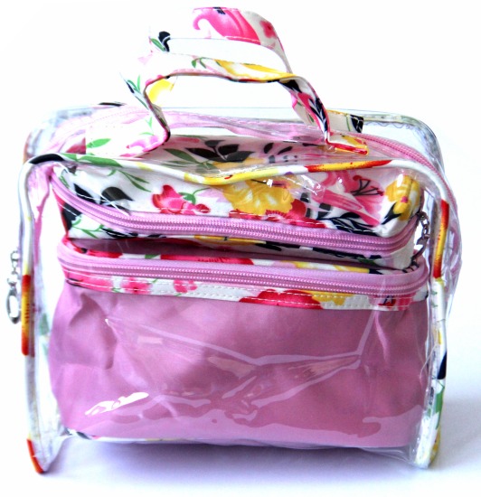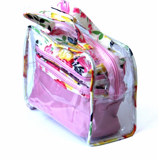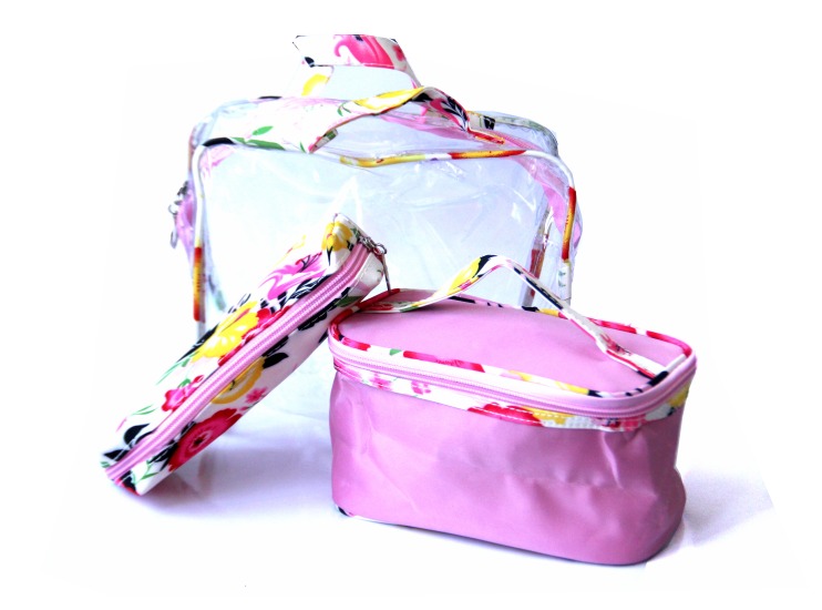 Ensemble de trois Trousses assorties spécial produit de beauté et maquillage. Ces trousses assorties sont de couleur rose clair avec motifs fleurs.