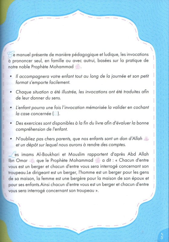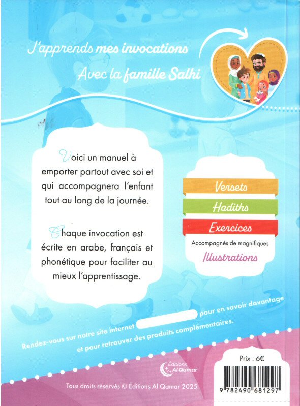 Un manuel ludique pour accompagner l’enfant tout au long de la journée, avec des invocations en arabe, français et phonétique, illustrées et accompagnées de versets, hadiths et exercices pour faciliter l’apprentissage. Inspiré de la pratique du Prophète Mohammad, ce guide permet à l’enfant de mémoriser, comprendre et vivre ses invocations au quotidien.
