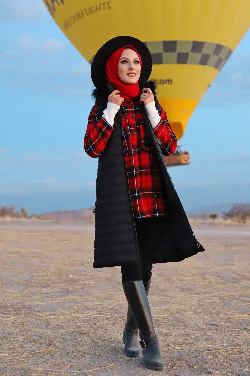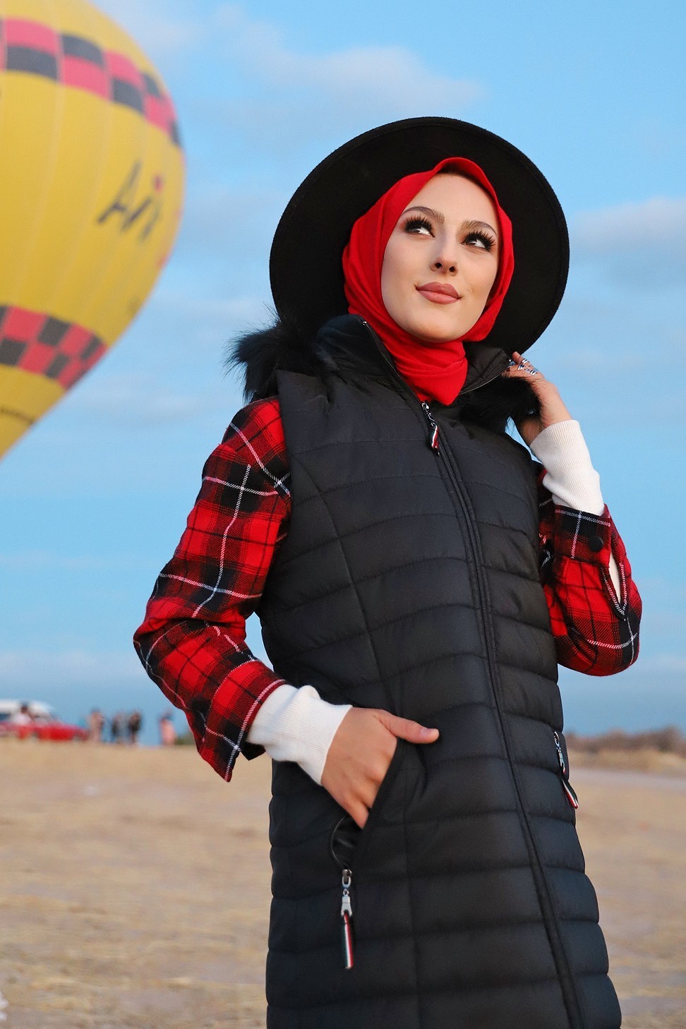 Robe à carreaux (Vetement hijab moderne) - Couleur anthracite et rouge - REF. 35217 (24.90 €)