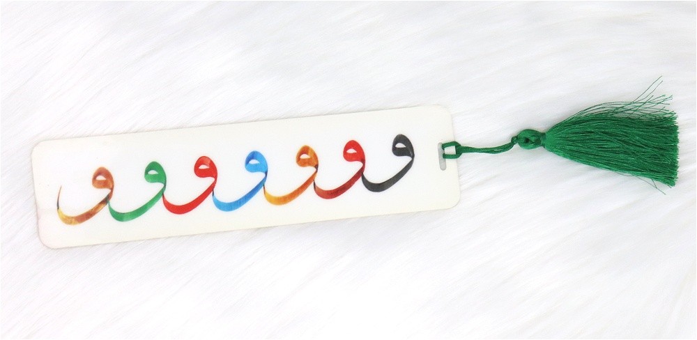 Marque-page avec pompon en sabra vert - Calligraphie multicolore de la lettre arabe "wâw" en plusieurs couleurs Deco & Cadeau
