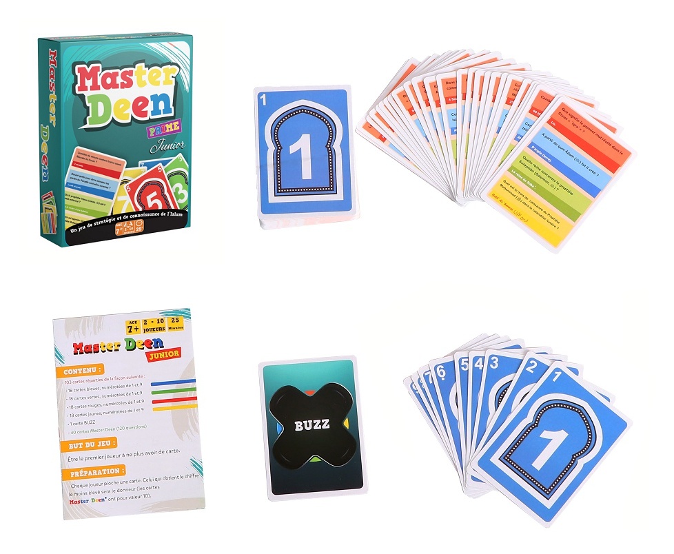 Master Deen se veut un jeu de stratégie et de connaissance de l'Islam. Il contient 110 cartes avec 120 questions : sur le Coran, les Prophètes, le Prophète Mohamed (PBSL) et des questions générales sur l'Islam.