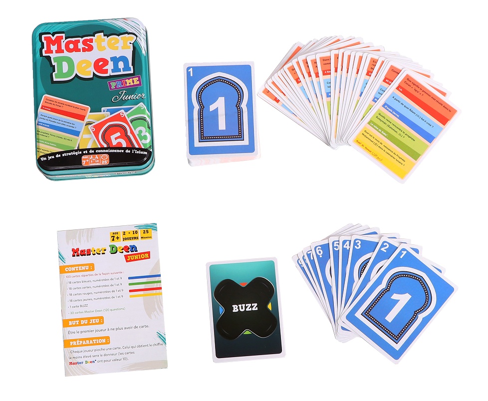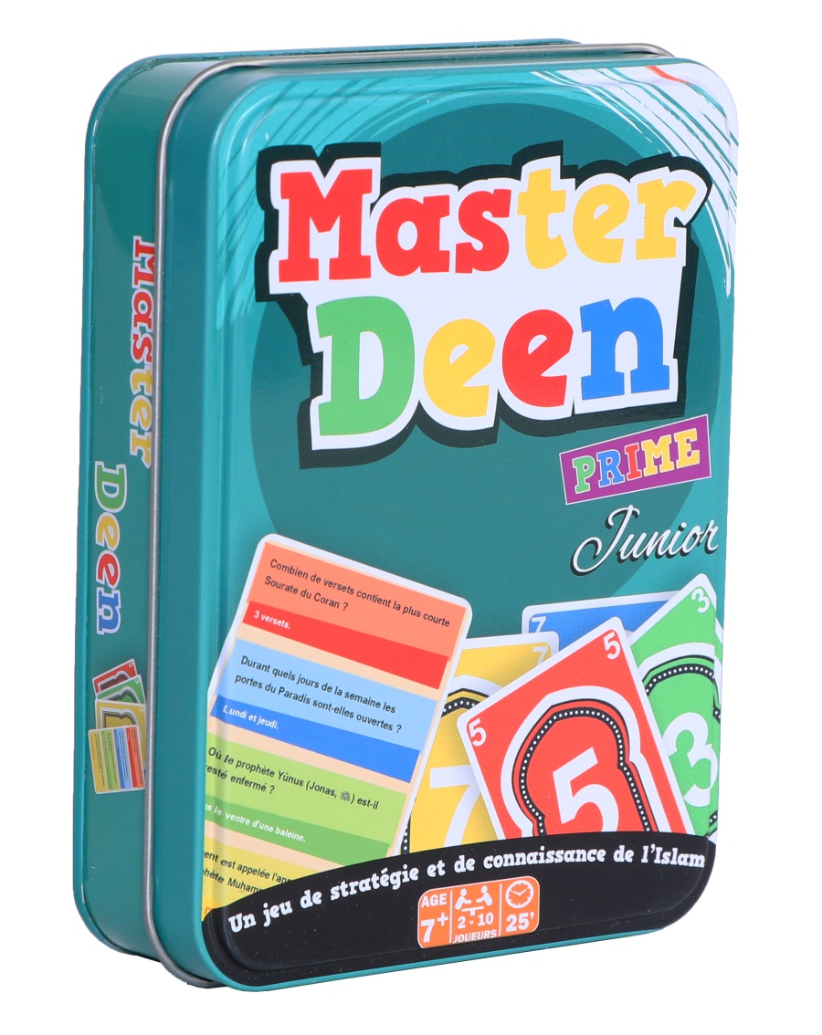 Master Deen se veut un jeu de stratégie et de connaissance de l'Islam. Il contient 110 cartes avec 120 questions : sur le Coran, les Prophètes, le Prophète Mohamed (PBSL) et des questions générales sur l'Islam.