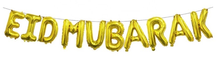 • 10 grands ballons dorés (40 cm de haut) formant les lettres "EID MUBARAK". Notez que chaque ballon-lettre possède deux endroits persés pour passer la ficelle dorée.