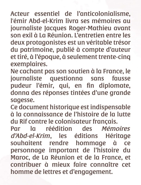 Ce document historique est indispensable à la connaissance de l'histoire de la lutte du Rif contre le colonisateur français. Par la réédition des Mémoires d'Abd-el-Krim, les éditions Héritage souhaitent rendre hommage à ce personnage important de l'histoire du Maroc, de La Réunion et de la France, et contribuer à mieux faire connaître cet homme de lettres et d'engagement.