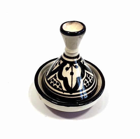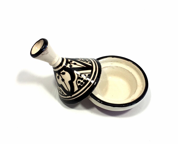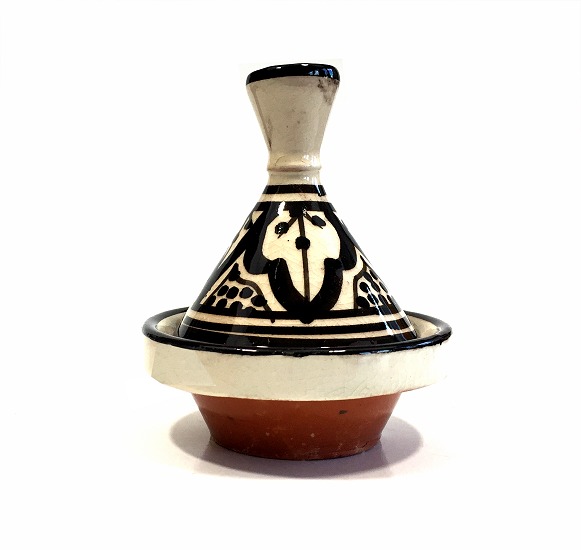 Mini tajine décoratif marocain en poterie de couleur blanc avec motifs noirs émaillé - REF. 29188 (4.90 €)