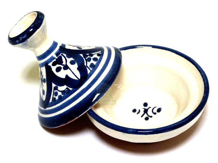 Mini tajine marocain décoratif en poterie de couleur blanc émaillé avec motifs bleus peints - REF. 19575 (4.90 €)
