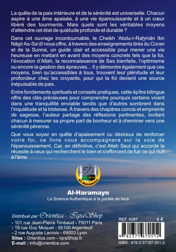 Entre fondements spirituels et conseils pratiques, cette épître bilingue offre des clés précieuses pour comprendre pourquoi certains vivent dans une tranquillité enviable tandis que d'autres sombrent dans l’inquiétude et la tristesse. À travers des chapitres concis et empreints de sagesse, l’auteur partage des réflexions pertinentes, invitant chacun à mesurer sa propre part de bonheur et à cheminer vers une sérénité pérenne.