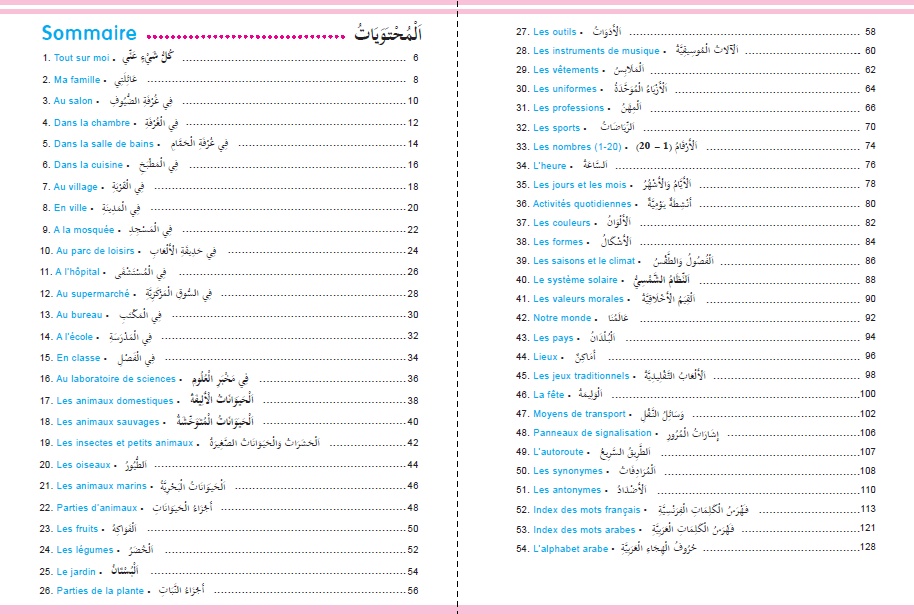 Cet imagier pédagogique et ludique, qui comporte des milliers de mots dans les deux langues, illustrés et regroupés en thèmes, permet de faciliter la lecture et l’apprentissage en stimulant la mémoire visuelle. Aussi, les illustrations des différentes scènes et situations de la vie quotidienne familiarisent l'enfant avec le monde qui l’entoure et l’accompagnent en douceur dans l’apprentissage de ces deux langues précieuses.