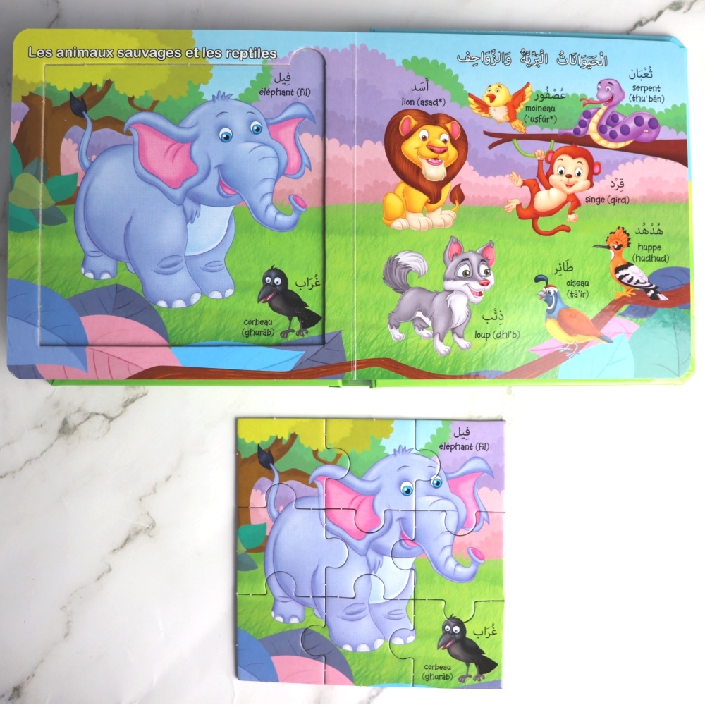 Retrouvez les animaux cités dans le Coran dans ce magnifique livre bilingue (français/arabe) contenant 6 puzzles de 9 pièces à faire et à refaire !