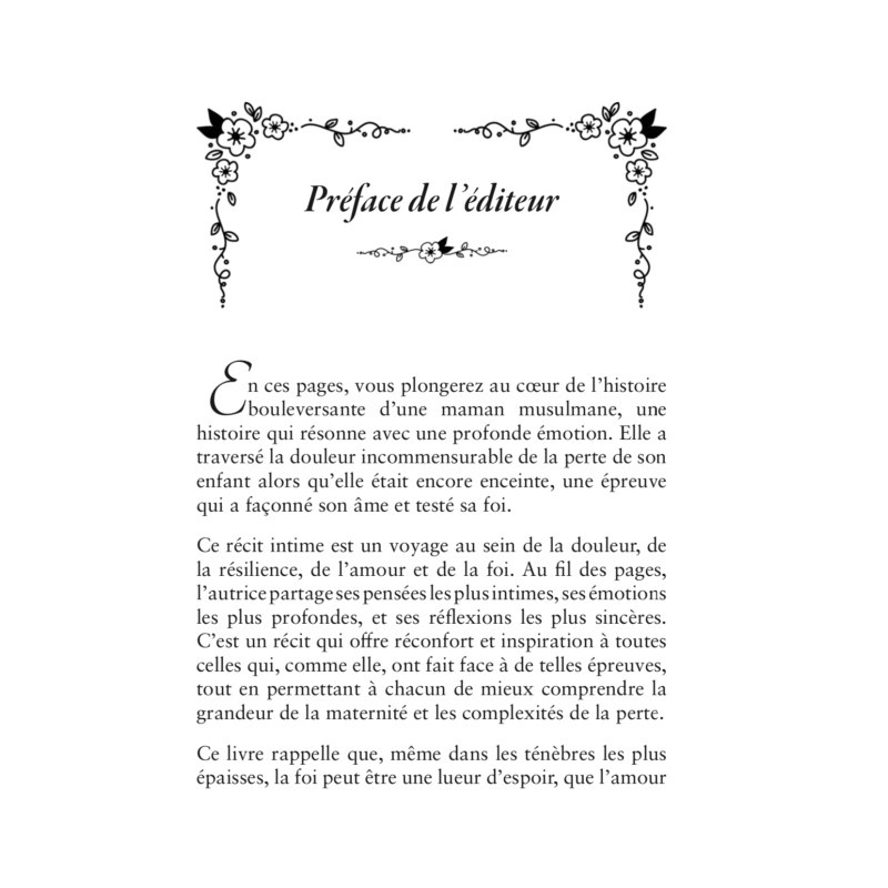En ces pages, plongez au cœur de l'histoire bouleversante d'une maman musulmane. Un récit empreint d'une profonde émotion, où Belkiz Taylan traverse la douleur incommensurable de la perte de son enfant pendant la grossesse. Cette épreuve a façonné son âme et testé sa foi. Un voyage intime dans la douleur, la résilience, l'amour, et la foi. L'autrice partage ses pensées les plus intimes, ses émotions les plus profondes, et ses réflexions les plus sincères. Ce livre offre réconfort et inspiration à toutes celles qui ont fait face à des épreuves similaires, tout en permettant à chacun de mieux comprendre la grandeur de la maternité et les complexités de la perte. Il rappelle que, même dans les ténèbres les plus épaisses, la foi peut être une lueur d'espoir, que l'amour maternel est une force infinie, et que chaque vie, quelle que soit sa durée, laisse une empreinte indélébile. Il nous montre également la beauté dans la tristesse et la lumière dans l'obscurité.