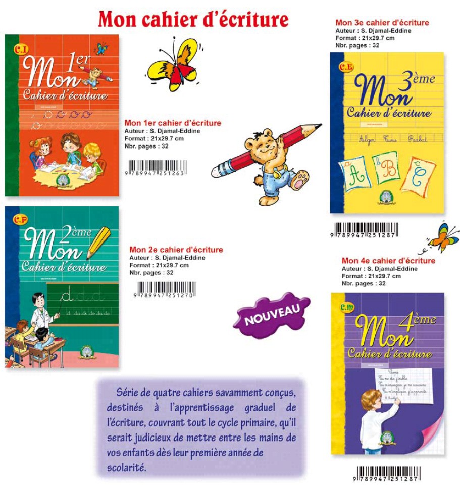 Quatre fascicules englobant une démarche d'apprentissage de l'écriture organisée selon des concepts pédagogiques modernes et fiables, allant du tracé de la lettre à l'écriture cursive et déliée.