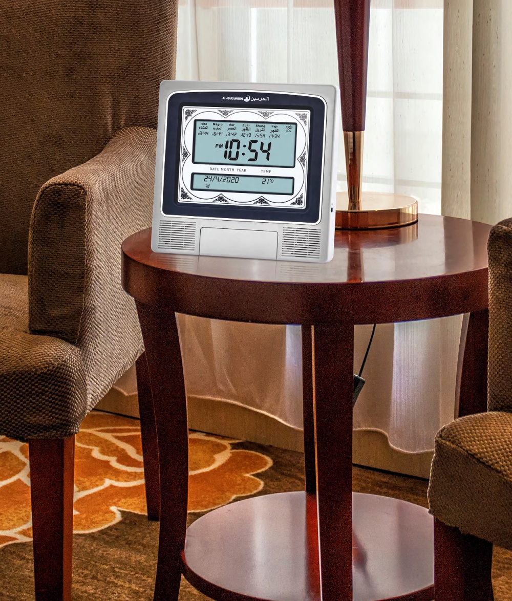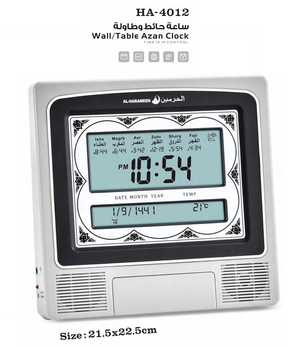 Montre Horloge Pendule (double ecran) avec horaires des prieres et appel a la priere (Adhan automatique) - Al-Harameen Clock (HA-4012)