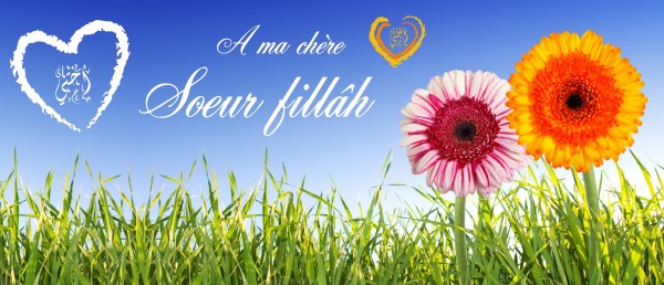 Tasse avec inscription : à ma chère soeur fillâh" (en Allah)... Avec le mot arabe "Oukhtî" calligraphié à l'intérieur des deux coeurs à droite et à gauche.