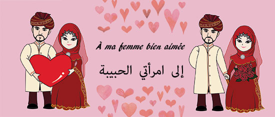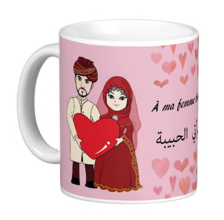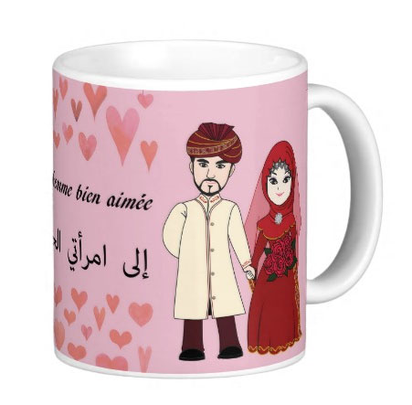 Mug "À ma femme bien aimée" (إلى زوجتي الحبيبة) avec l'illustration d'un couple musulman...