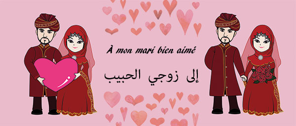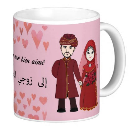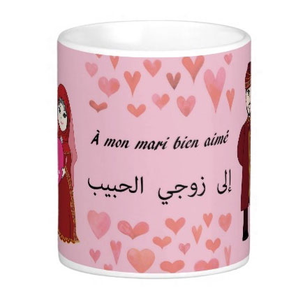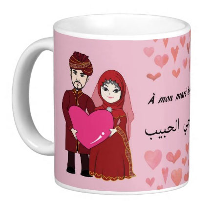 Mug "À mon mari bien aimé" (إلى زوجي الحبيب) avec l'illustration d'un couple musulman...