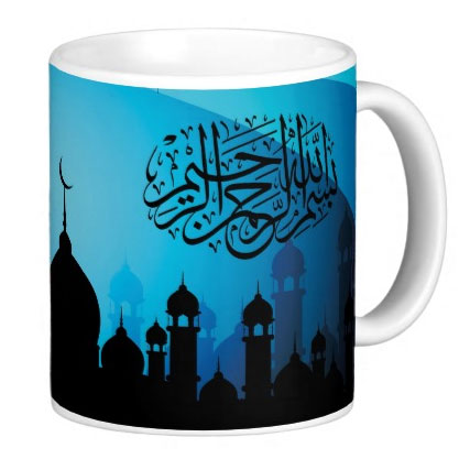 Mug avec calligraphie arabe : Bismi-l-Lâhi r-Rahmâni r-Rahîm (بسم الله الرحمن الرحيم)...