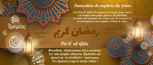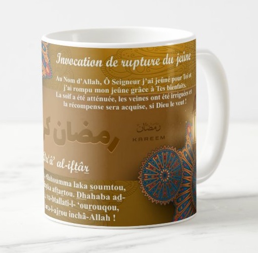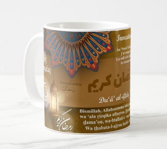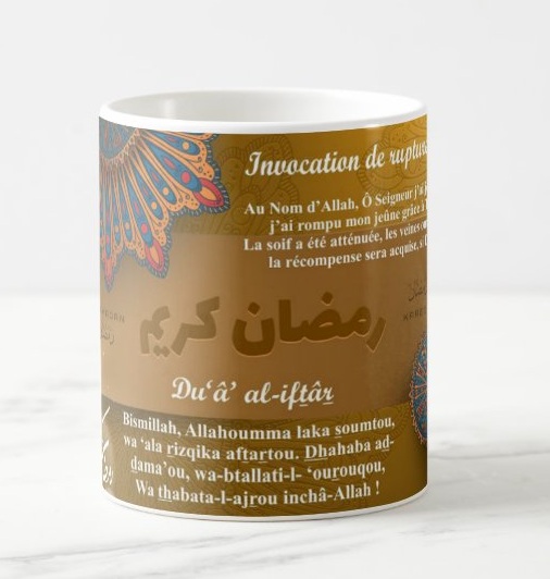 Mug pour la rupture du jeûne et inscription Ramadan Karim (Bon Ramadan) et français et arabe + invocation de rupture du jeune (Dou'a al iftâr). Qu'Allah accepte votre jeûne à tous durant le mois de Ramadan et durant le reste des jours de l'année où vous jeûnerez.