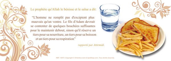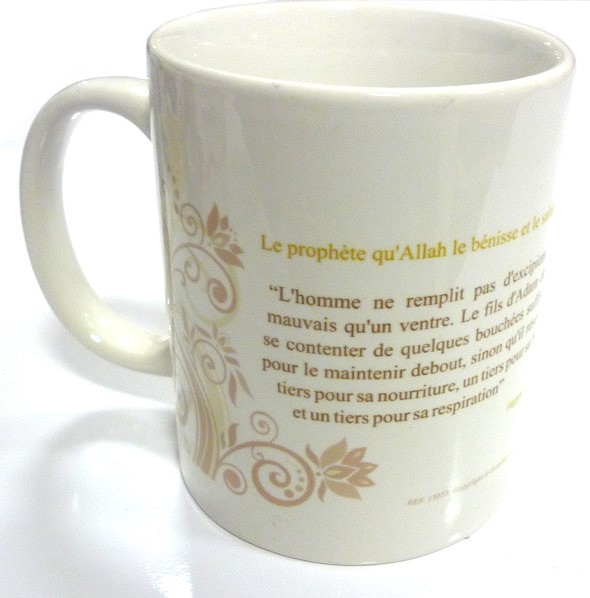 Mug avec le hadith suivant (excellent rappel quand on mange) : Le prophète qu'Allah le bénisse et le salue a dit: “L'homme ne remplit pas d'excipient plus mauvais qu'un ventre. Le fils d'Adam devrait se contenter de quelques bouchées suffisantes pour le maintenir debout, sinon qu'il réserve un tiers pour sa nourriture, un tiers pour sa boisson et un tiers pour sa respiration” rapporté par Attirmidi. Notez que le contenu de ce hadith est confirmé par la médecine moderne.