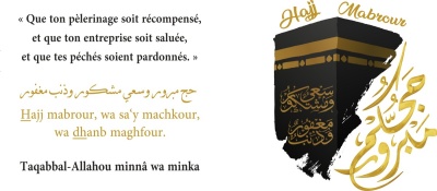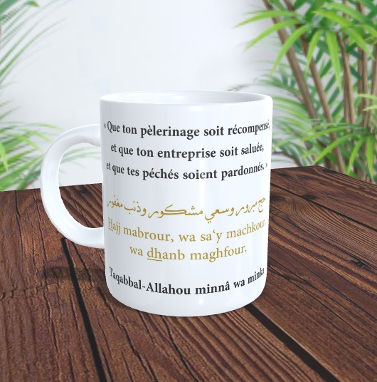 Mug contenant l'invocation (du'a) en arabe qu'il faut dire au pèlerin (hajj ou hajja) à l'occasion du retour du pèlerinage : "Que ton pèlerinage soit récompensé, et que ton entreprise soit saluée, et que tes péchés soient pardonnés."