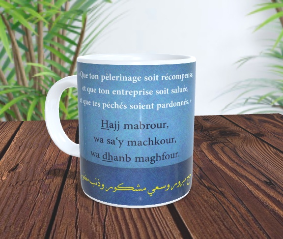 Mug contenant l'invocation (du'a) en arabe qu'il faut dire au pèlerin (hajj ou hajja) à l'occasion du retour du pèlerinage : "Que ton pèlerinage soit récompensé, et que ton entreprise soit saluée, et que tes péchés soient pardonnés."