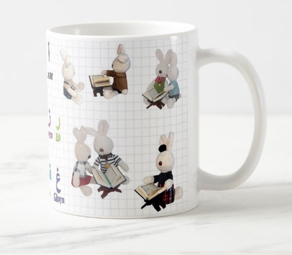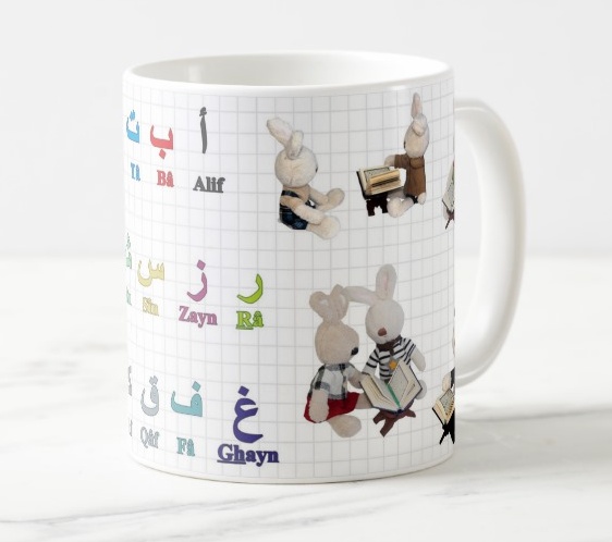Mug avec l'alphabet arabe et les petits lapins musulmans de la famille Arnoube entrain de lire le Coran.