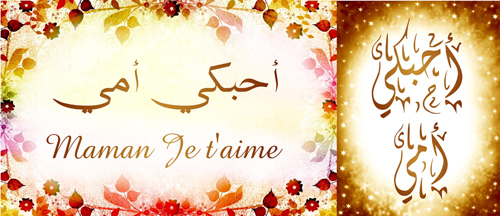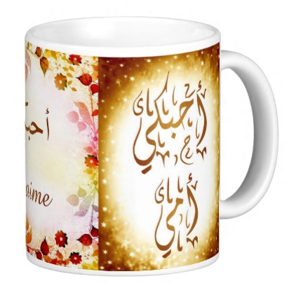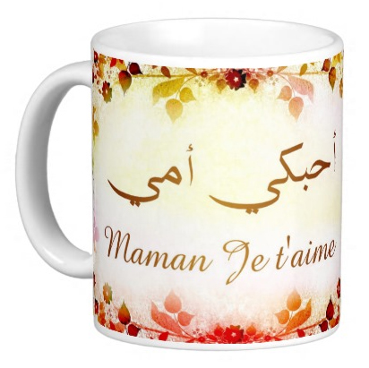 Mug avec la formule "Maman je t'aime" écrit en français, en arabe (أحبك أمي) et calligraphié de façon artistique en arabe sur la partie droite.