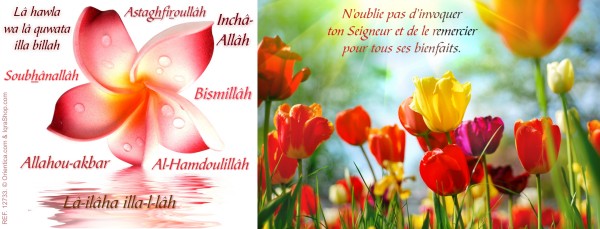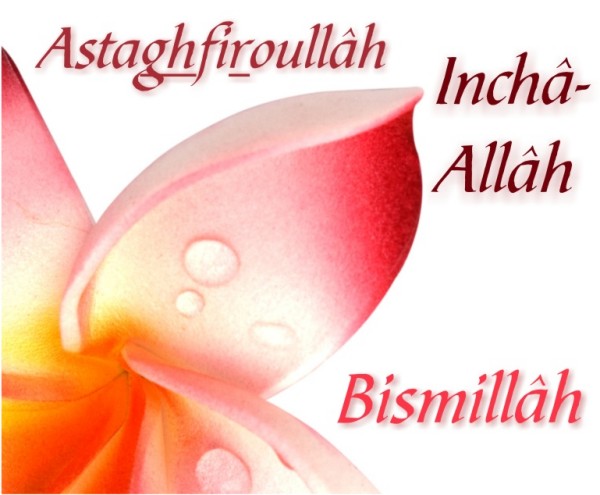 Avec l'écriture phonétique des invocations les plus courantes : Bismillâh, Al-Hamdoulillâh, Lâ hawla wa lâ quwata illa billah, Astaghfiroullâh, Inchâ-Allâh, Soubhânallâh, Allahou-akbar, Lâ-ilâha illa-l-lâh.