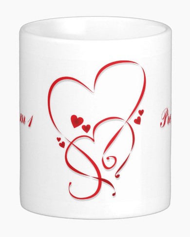 Mug personnalisable avec design artistique de cœurs rouges imbriqués.