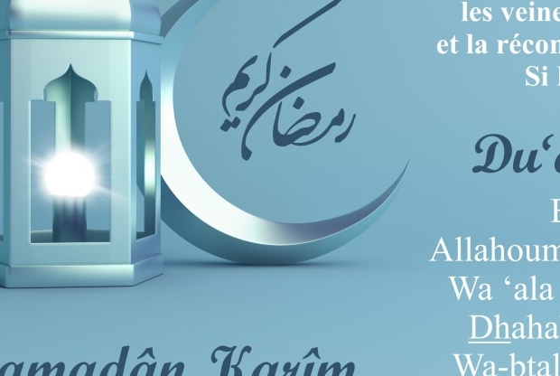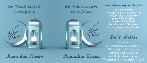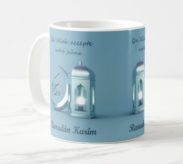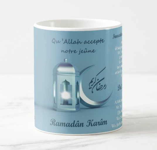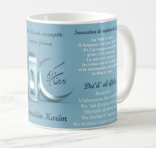 Mug pour la rupture du jeûne et inscription Ramadan Karim (Bon Ramadan) et français et arabe + invocation de rupture du jeune (Dou'a al iftâr). Qu'Allah accepte votre jeûne à tous durant le mois de Ramadan et durant le reste des jours de l'année où vous jeûnerez.