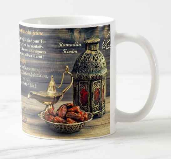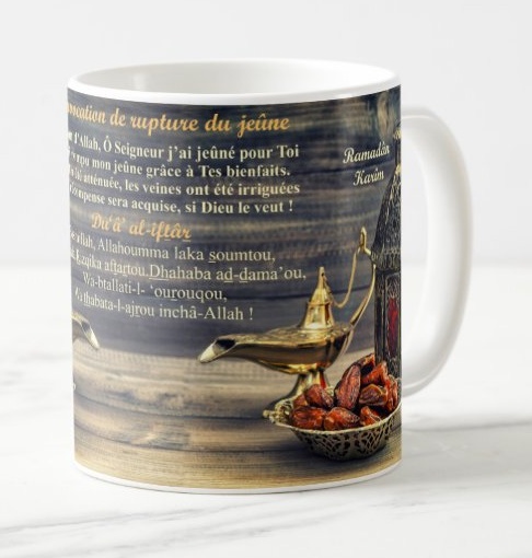 Mug pour la rupture du jeûne et inscription Ramadan Karim (Bon Ramadan) et français et arabe + invocation de rupture du jeune (Dou'a al iftâr). Qu'Allah accepte votre jeûne à tous durant le mois de Ramadan et durant le reste des jours de l'année où vous jeûnerez.