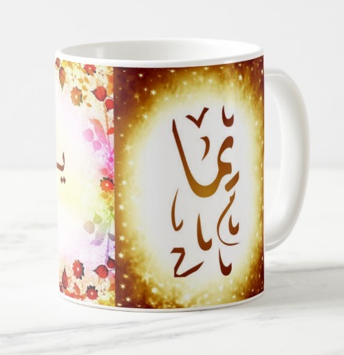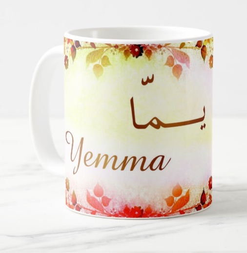 Mug "Yemma" écrit en français, en arabe (يمّا) et calligraphié de façon artistique en arabe sur la partie droite.
