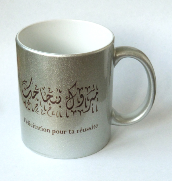 Mug argenté avec l'inscription en français et en arabe : "Félicitation pour ta réussite" / "مبروك بنجاحك", inscription des deux côtés de la tasse. Idéal pour offrir à toutes les occasion de réussite tel qu'un examen.