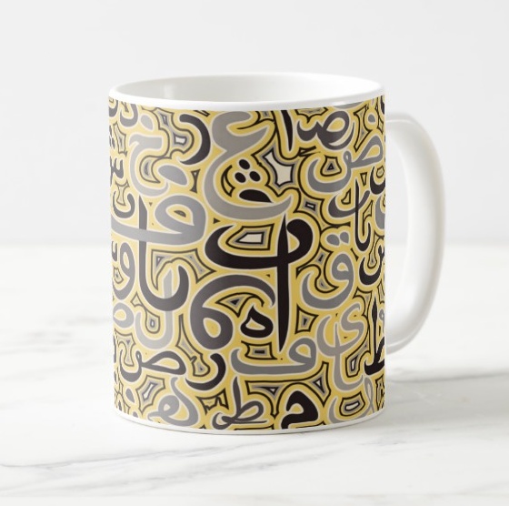 Mug avec alphabet arabe artistique et arabesques (fond jaune)