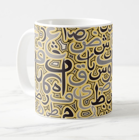 Tasse avec calligraphies artistiques de lettres arabes isolées et entrelacées... en noir et gris sur fond jaune...