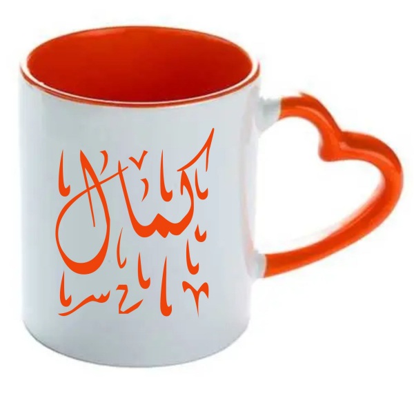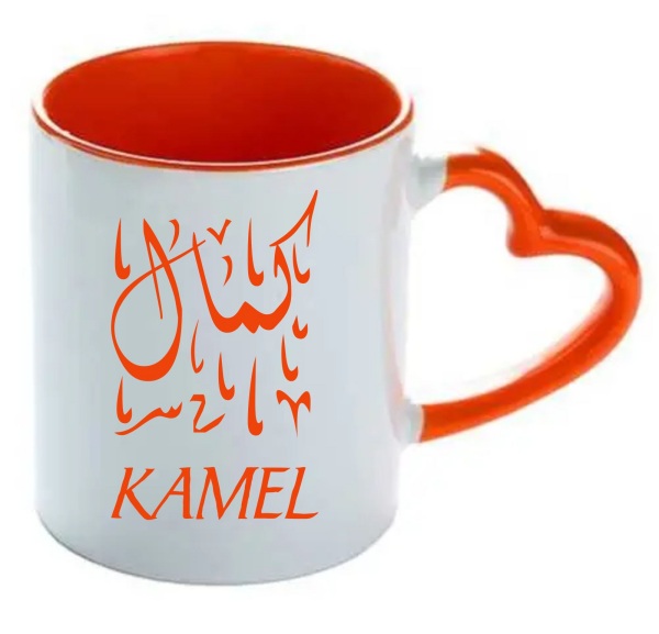 Profitez de recevoir cette tasse avec anse (poignée sous forme de coeur et intérieur de couleur orange) avec l'inscription du prénom calligraphié en arabe et/ou en français ou un message en français. S'il s'agit d'un prénom, vous pouvez choisir un style parmi les quatre (voir image ci-dessous).