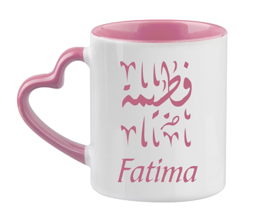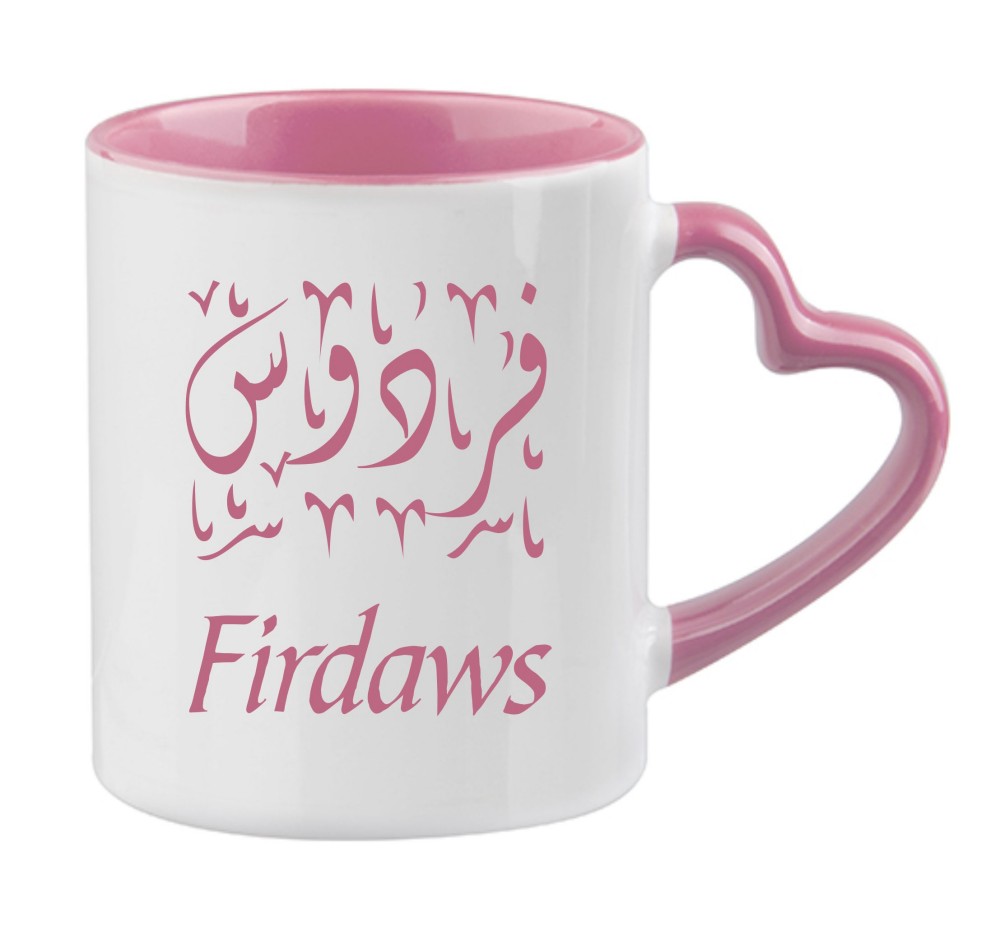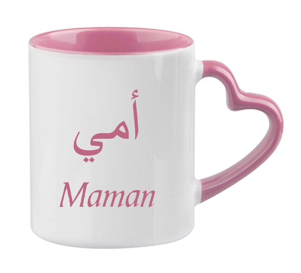 Profitez de recevoir cette tasse avec anse (poignée sous forme de coeur et intérieur roses) avec l'inscription du prénom calligraphié en arabe et/ou en français ou un message en français. S'il s'agit d'un prénom, vous pouvez choisir un style parmi les quatre (voir image ci-dessous).
