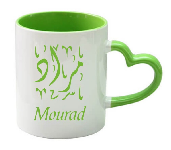 Profitez de recevoir cette tasse avec anse (poignée sous forme de coeur et intérieur verts) avec l'inscription du prénom calligraphié en arabe et/ou en français ou un message en français. S'il s'agit d'un prénom, vous pouvez choisir un style parmi les quatre (voir image ci-dessous).