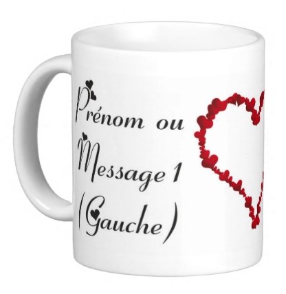 Tasse blanche à personnaliser avec un ou deux prénoms/messages (à gauche et à droite du coeur). Vous pouvez choisir la forme du coeur et la couleur d'écriture des prénoms/messages.