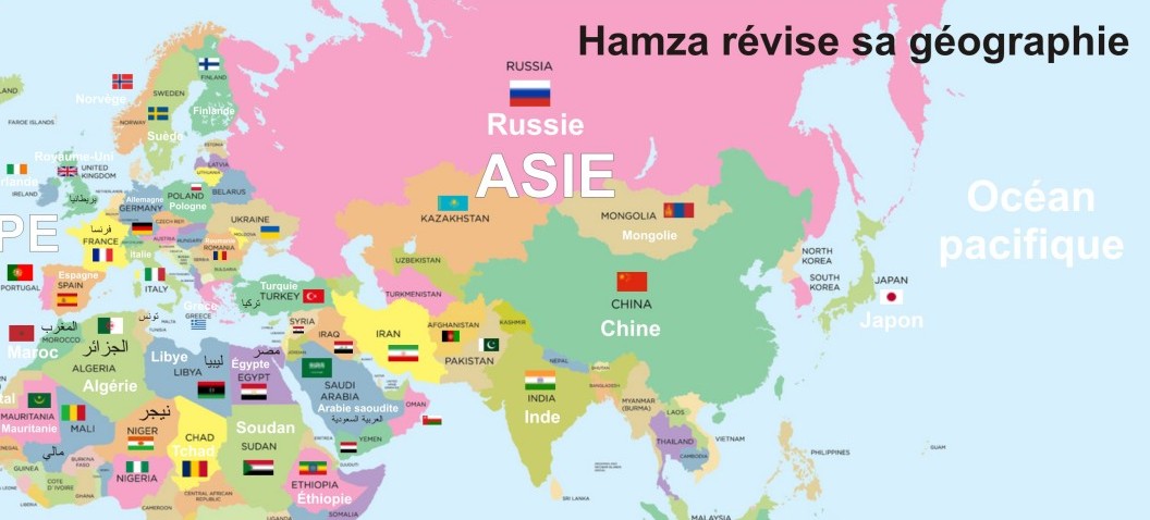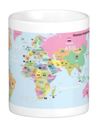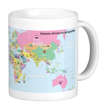 Mug personnalisable avec le message de votre choix (Exempoe Hamza révise sa géographie). Ce mug vous permettant d'apprendre la géographie des pays grâce à cette belle carte du monde qui entoure le mug avec inscription des pays en français anglais et arabe ainsi que le drapeau (pour la plupart des pays).