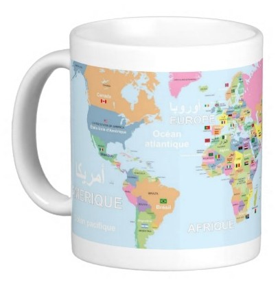 Mug personnalise pedagogique "Carte geographique du monde avec drapeaux" (francais/arabe/anglais)