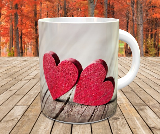 Mug 2 cœurs rouges en bois - Tasse cadeau avec deux messages personnalisables - REF. 36856 (9.90 €)