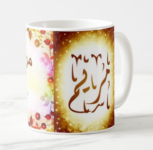 Mug avec le prénom "Mariama" écrit en français, en arabe (مريم) et calligraphié de façon artistique en arabe sur la partie droite.