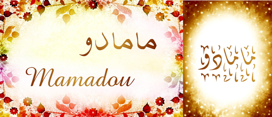 Mug avec le prénom "Mamadou" écrit en français, en arabe (مامادو) et calligraphié de façon artistique en arabe sur la partie droite.