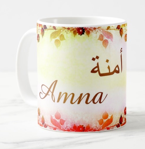 Mug avec le prénom Amna calligraphié en arabe ainsi que son écriture normale en arabe (أمنة) et en français.