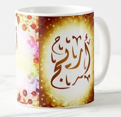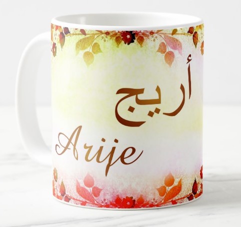 Mug avec le prénom "Arije" écrit en français, en arabe (أريج) et calligraphié de façon artistique en arabe sur la partie droite.
