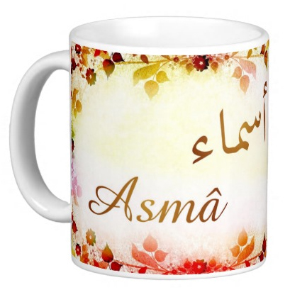 Mug avec le prénom "Asmâ" écrit en français, en arabe (أسماء) et calligraphié de façon artistique en arabe sur la partie droite.