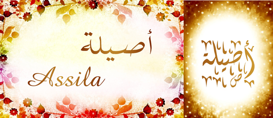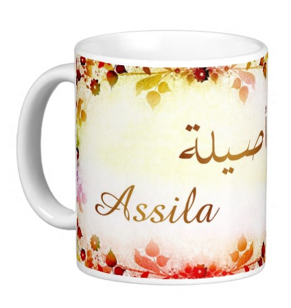Mug avec le prénom "Assila" écrit en français, en arabe (أصيلة) et calligraphié de façon artistique en arabe sur la partie droite.