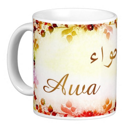 Mug avec le prénom "Awa" écrit en français, en arabe (حواء) et calligraphié de façon artistique en arabe sur la partie droite.