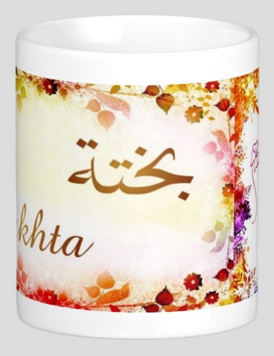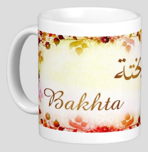 Mug avec le prénom "Bakhta" écrit en français, en arabe (بختة) et calligraphié de façon artistique en arabe sur la partie droite.