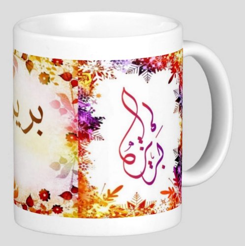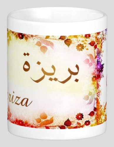 Mug avec le prénom "Bariza" écrit en français, en arabe (بريزة) et calligraphié de façon artistique en arabe sur la partie droite.